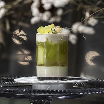 アニス香るフランボワーズのソースに緑茶のブランマンジェにベルベンヌのジュレとメロンを合わせました