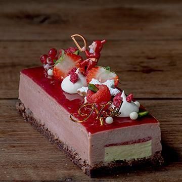 3種のベリー(フランボワーズ、フレーズ、フレーズデボワ)の華やかなクリームに、ピスタチオムースを重ねたクリスマスケーキ。